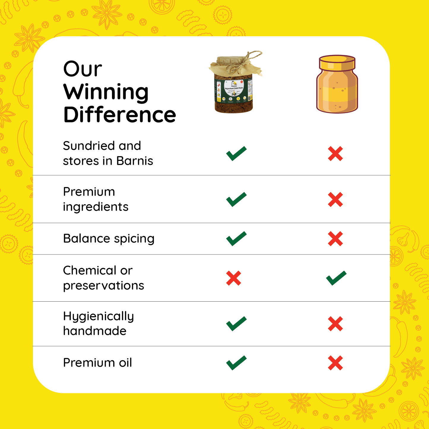 We use premium quality mustard oil in the preparation of this pickle. Also other ingredients such as chillies, garlic, and red chilli powder are of good quality.