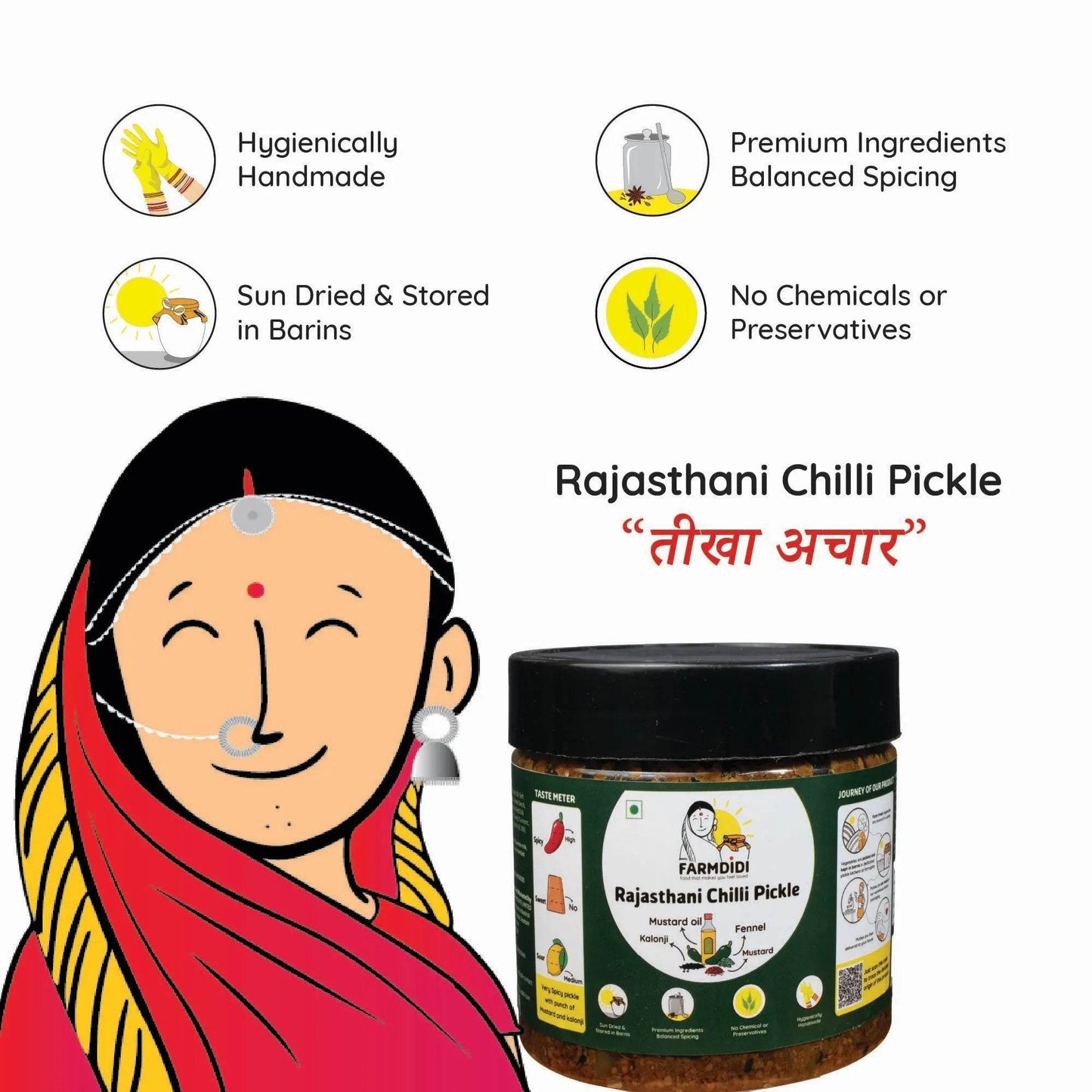 Our Rajasthani Green Chilli Pickle (Green Chili Achar) is a flavourful blend of heat and aromatic spices made by Rubaida didi from Uruli Kanchan.
