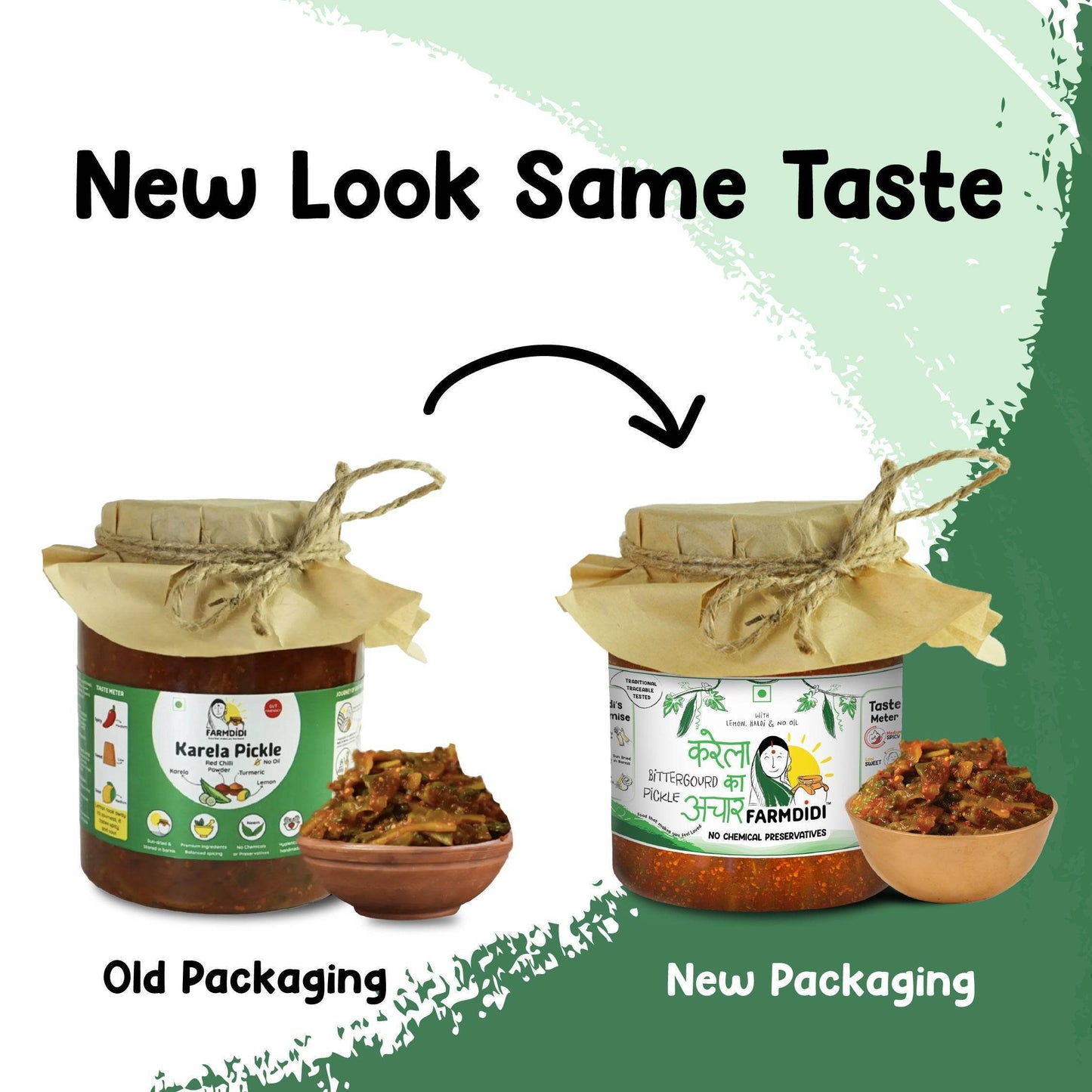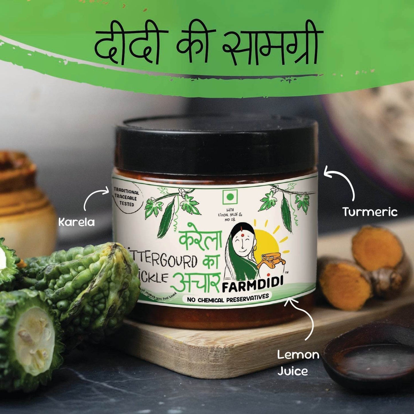 Farmdidi’s Karela Pickle (Karele ka achar), also known as karela ka achar, brings you a tangy and spicy surprise with every bite! Made using fresh bitter gourd, this handcrafted bitter gourd pickle is unlike anything you’ve tasted before. The natural bitterness of karela is beautifully balanced with the zing of lemon juice, the warmth of our traditional pickle masala, and just a hint of sweetness from sugar.