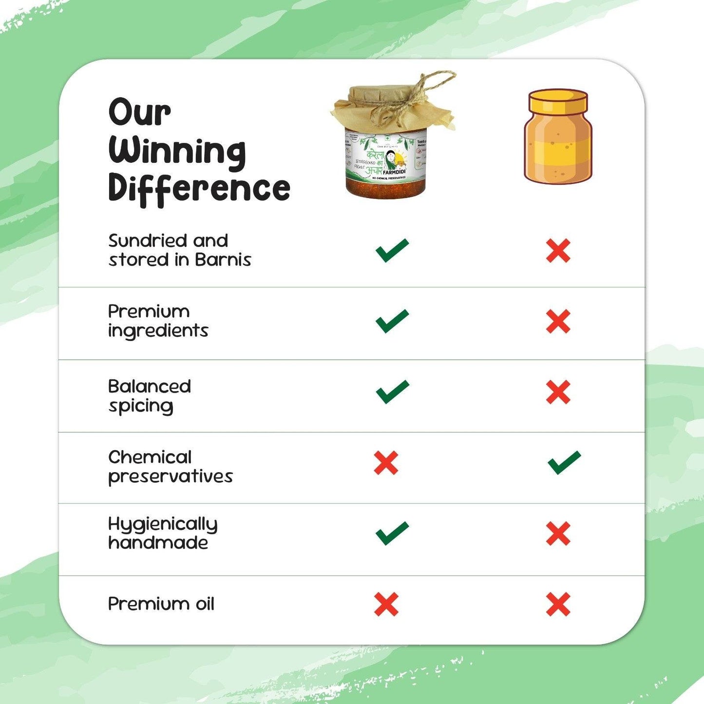 The liquid you see in the pickle is Lemon juice which removes the bitterness of the vegetable and acts as a natural preserving agent. Our didis also add whole neem leaves in the pickle for extending the shelf life.