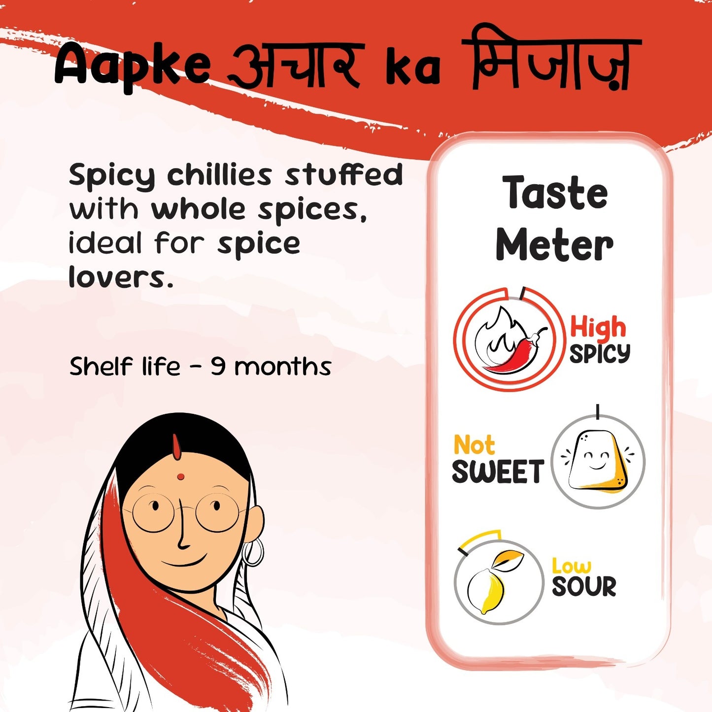 Farmdidi's Lal Mirch Ka Bharwa Achar is made with large, thick red chilies sourced directly from local farmers in Banaras. A blend of spices, including Kalonji (Nigella seeds), crushed yellow mustard seeds, Saunf (fennel seeds), coriander powder, and other spices is mixed with wood-pressed mustard oil.This mixture is then carefully stuffed into washed and cleaned red chilies, giving it the name "Bharua Lal Mirch Ka Achar" or “Banarasi Red Chilli Pickle”