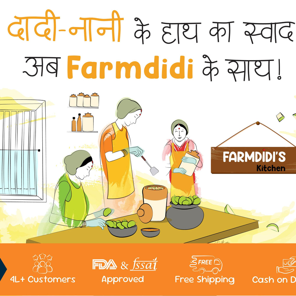 You can easily buy homemade pickles online at FarmDidi, your trusted source for authentic homemade pickle varieties. Our wide range of pickles(achar) includes preservative-free favorites like mango pickle, lemon pickle, garlic pickle, and chilli pickle, all crafted using traditional recipes by our didis. Each pickle(aachar) is handmade by rural women using sun-dried ingredients, premium quality oil, and zero preservatives. Whether you're craving spicy achaar, tangy aachar, sweet pickles or unique pickles like jackfruit pickle, FarmDidi offers the most flavorful and natural homemade pickles online.