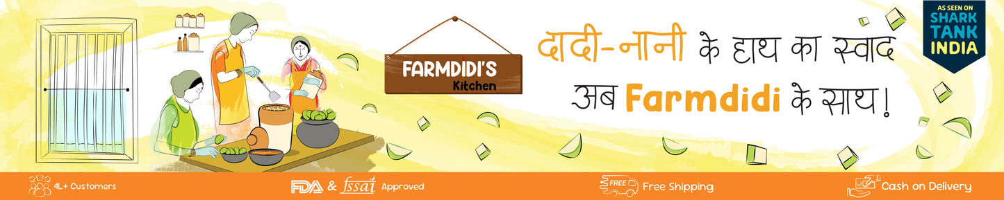 FarmDidi’s homemade pickles are made using traditional recipes, premium spices, and the pickles are sun dried and stored in barnis. Each homemade pickle is made in small batches by our rural didis, without preservatives or artificial flavors. From classic mango achar to tangy lemon pickle, our homemade pickles deliver an authentic taste that factory-made pickles simply can’t match.