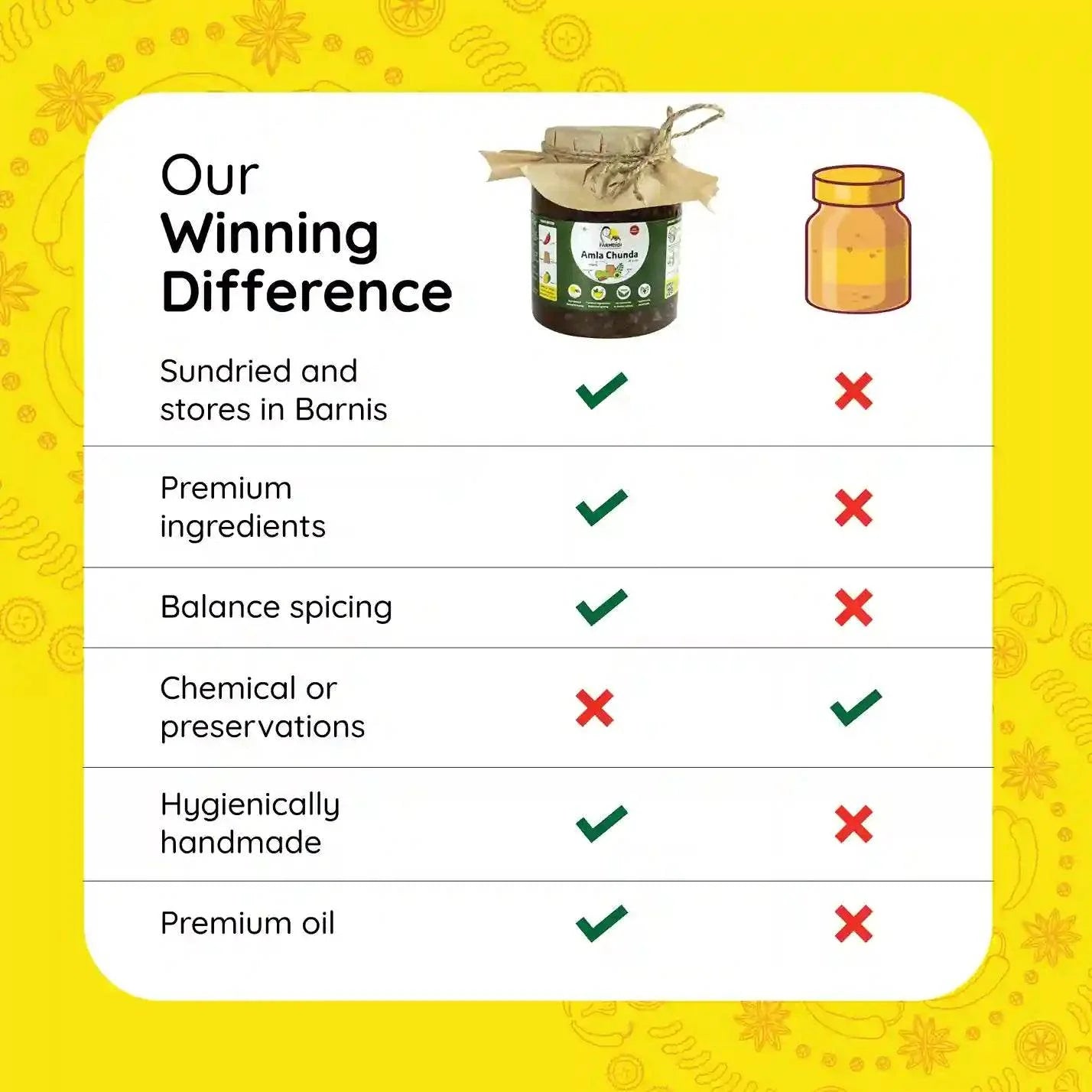 Amla is rich in antioxidants and Vitamin C, which helps boost immunity, improve digestion, and promote skin and hair health. Chunda also aids in gut health when consumed in moderation.