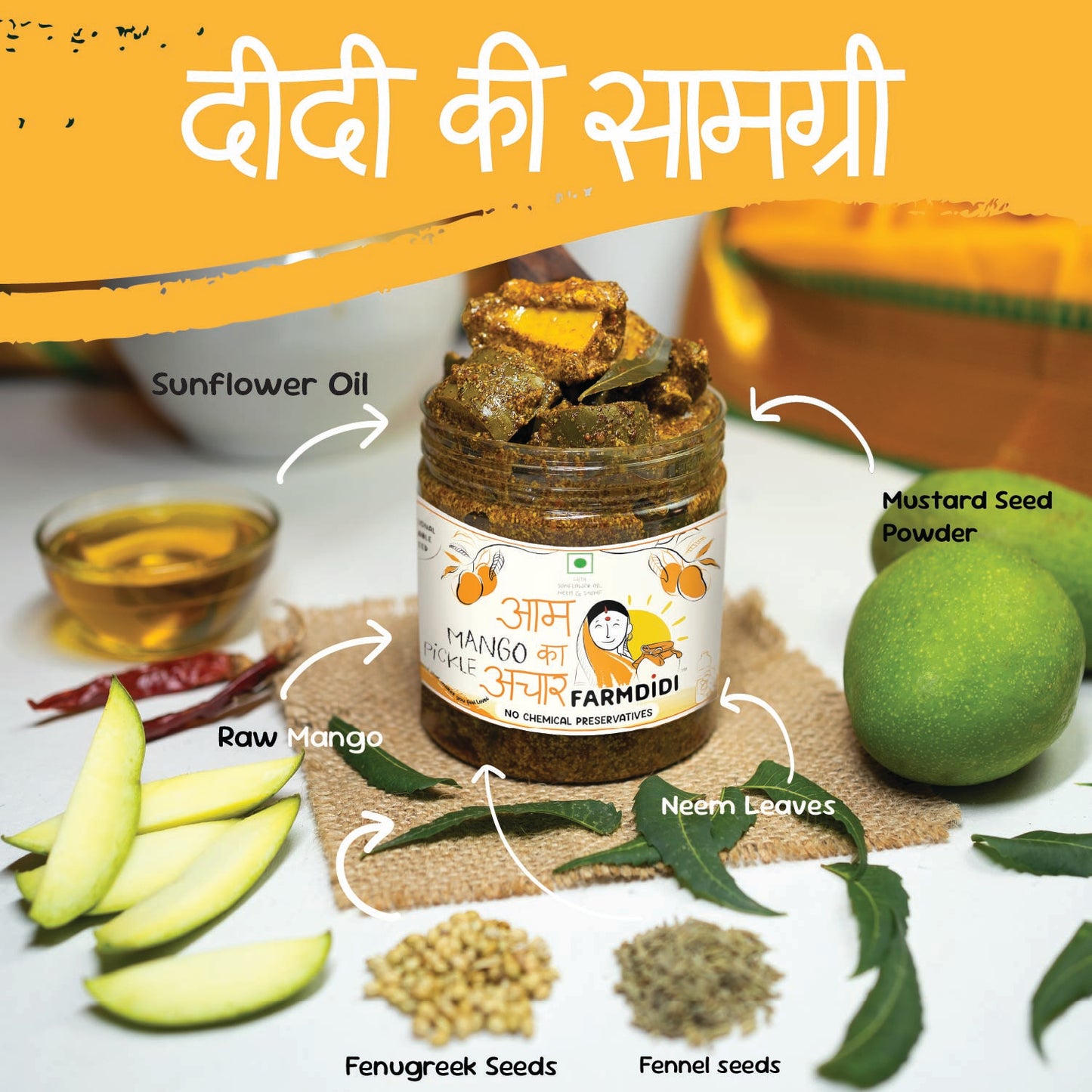 Key Ingredients Fennel seeds, Nigella seeds, Asafoetida Yellow mustard seeds, Fenugreek seeds Raw mango, Mustard powder, Guntur red chilli Sugar, Cumin powder, Asafoetida Jaggery